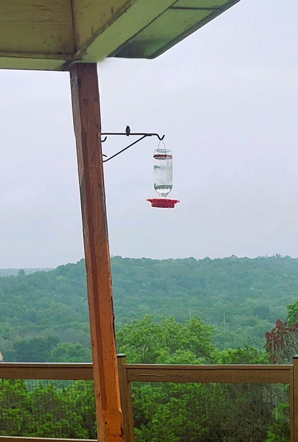 This spring and summer have not been stellar seasons for hummingbird watching around my house. One or two birds persistently visit the feeder, and so I, a dedicated “birder” persistently replace the sweet syrup, despite the abundant natural nectar available nearby. Today, the third morning in a row of rainfall, however, brought a change to one bird’s habit, as a tiny hummingbird landed near the top of my feeder. Neither hovering nor sipping, the hummer instead perched on the feeder’s metal support bracket for over 10 minutes- an eon in hummingbird time. Was it seeking shelter there under the porch eave? Its hunched silhouette reminded me of someone huddling for protection.
